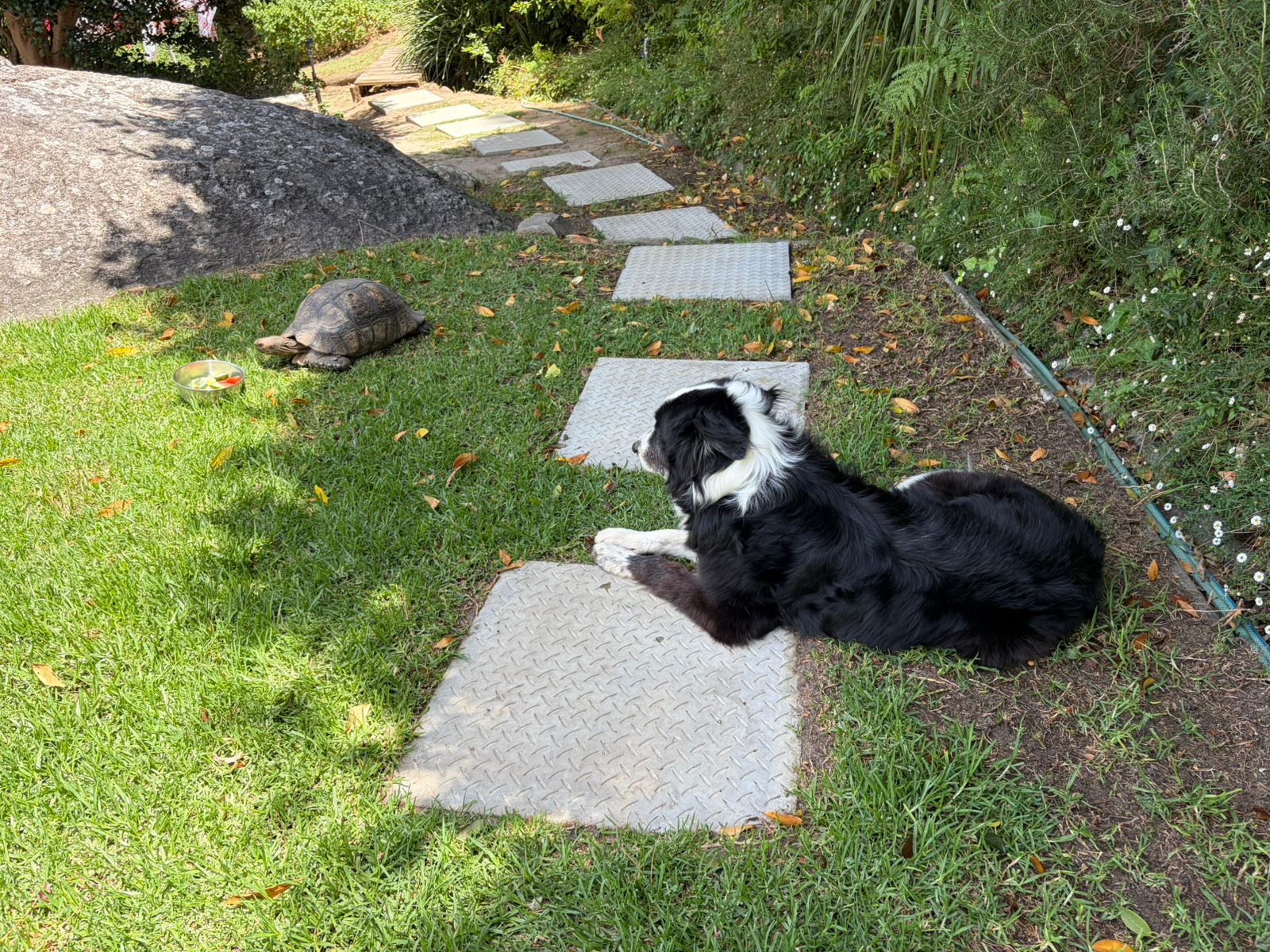 His perfect home was found as a result of helping someone else, who ended up helping me, with Buddy receiving the most wonderful blessing, where he can swim, bask in the sun, be-friend the guests, herd the tortoises and chase a stick to his heart's content.