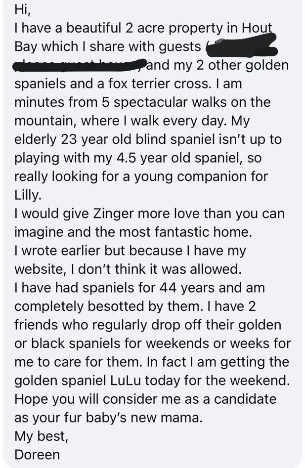 Here is where it comes full circle, one of the responses that Kirsten received, which she forwarded to me, was from a lovely lady called Doreen who sent the most beautiful message, offering Zinger a wonderful life with her and her pack.